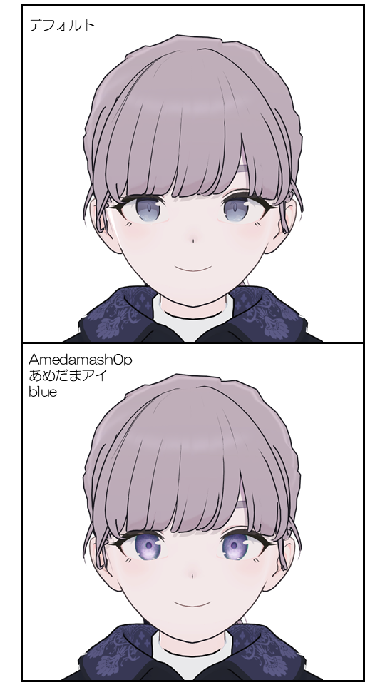 コロンとかわいい立体感のあるテクスチャです。金細工にある「槌目(つちめ)」のような瞳の模様が立体感を感じさせる特徴があります。分類するならキュート系かなと思っています。販売店のサムネがかわいく、優しい表情やキュートな表情が特に映えます。