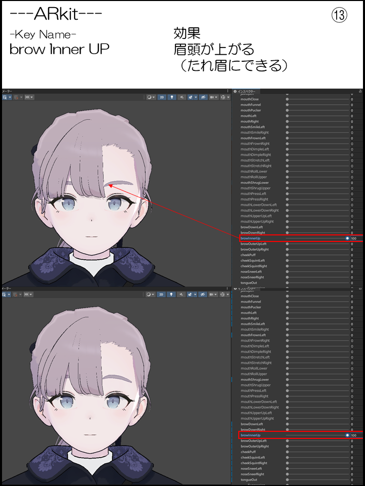 ⑬:眉頭が上がる(たれ眉にできる)