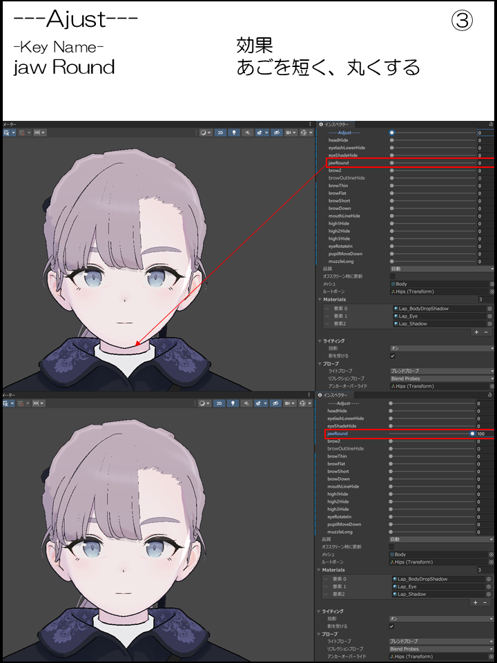 ③:あごを短く、丸くする
