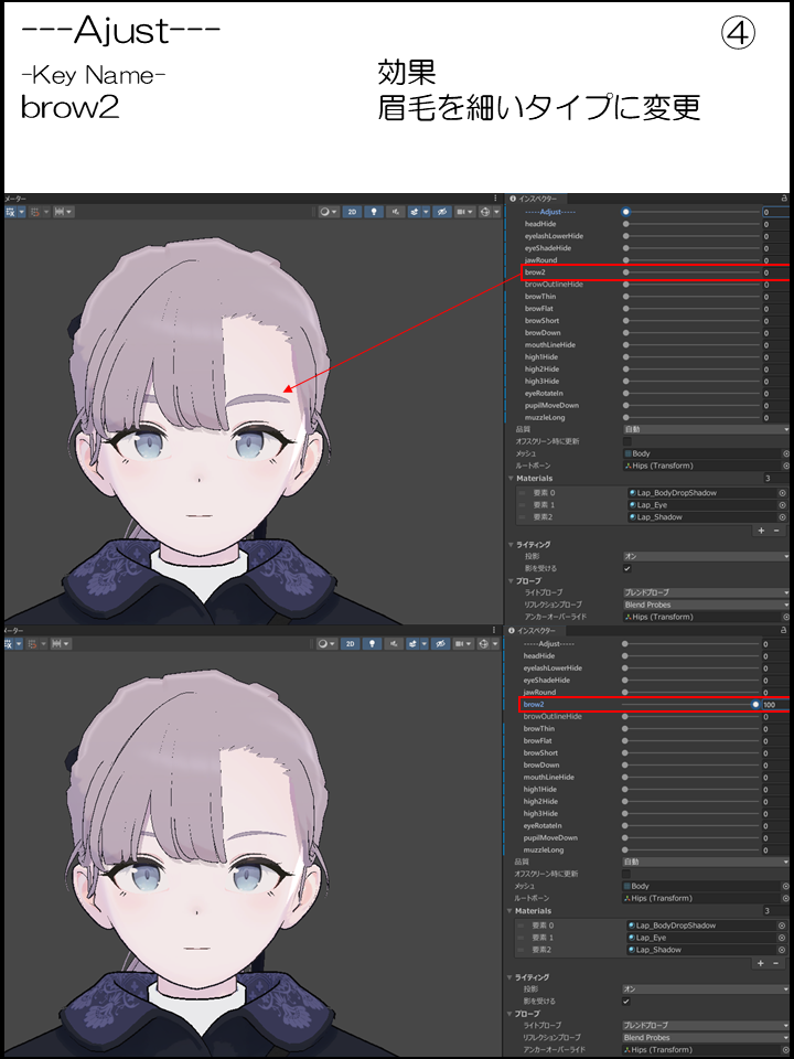④:眉毛を細いタイプに変更