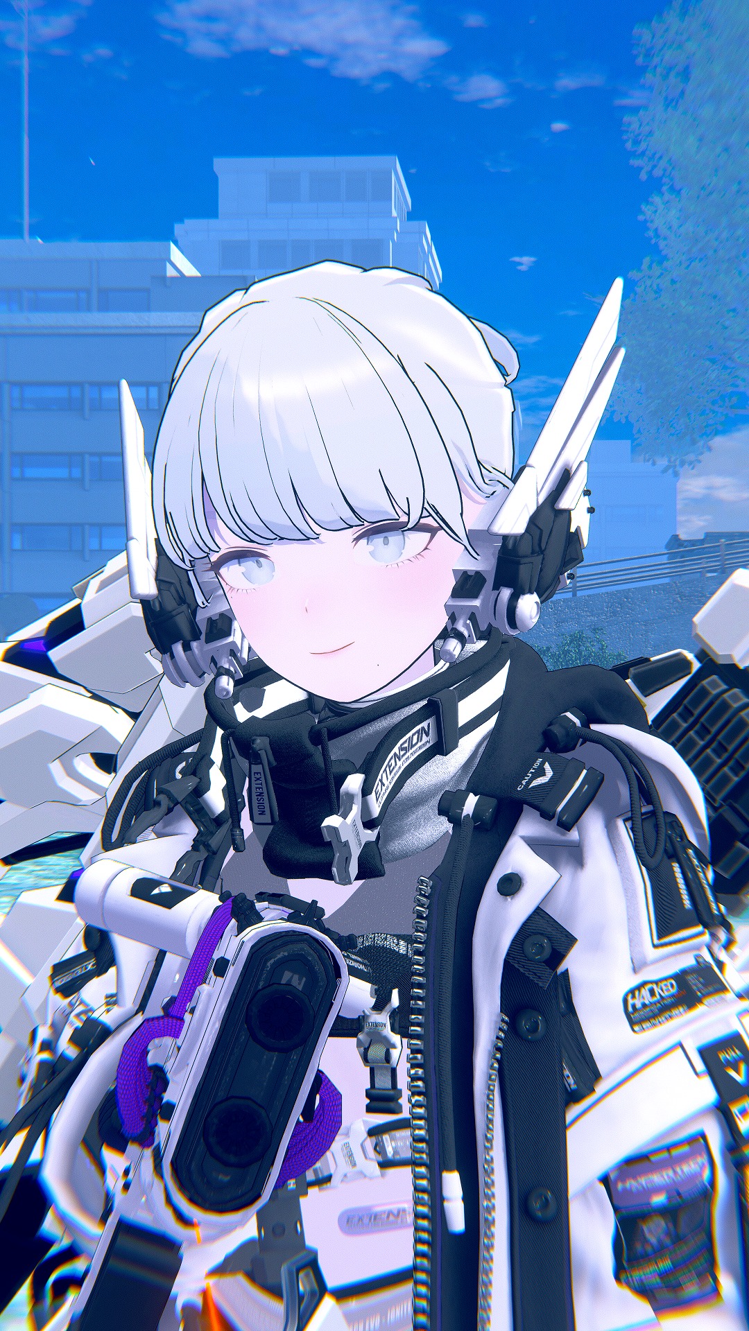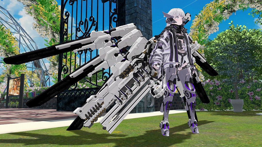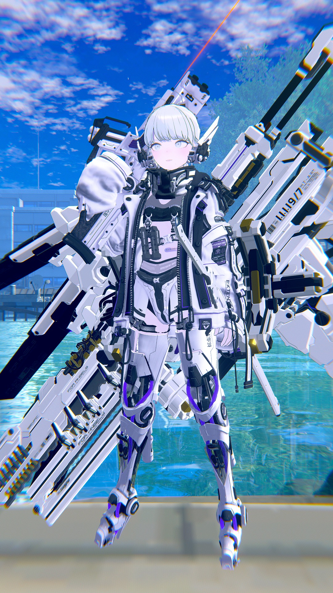 EXTENSION CLOTHING様の戦闘服をベースに少女×デカ武器というロマンを詰め込んだコーデ?をやってみました。Lapwingのイメージに合わせて白ベースで各武器を統一し、武器の発光色も紫で合わせています。マシンチックなヘイローとかをつけてしまうと某ソシャゲに出てきそうな感じがしますね。戦闘系SSを撮るようのコーデができてとっても満足です。